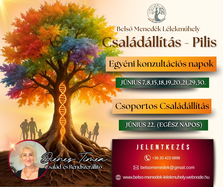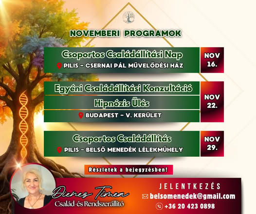 Ebben a hónapban is várlak szeretettel családállítási napokon, egyéni konzultációkon és hipnózis üléseken, hogy együtt oldjuk a múlt elakadásait, és teret adjunk az új energiáknak.